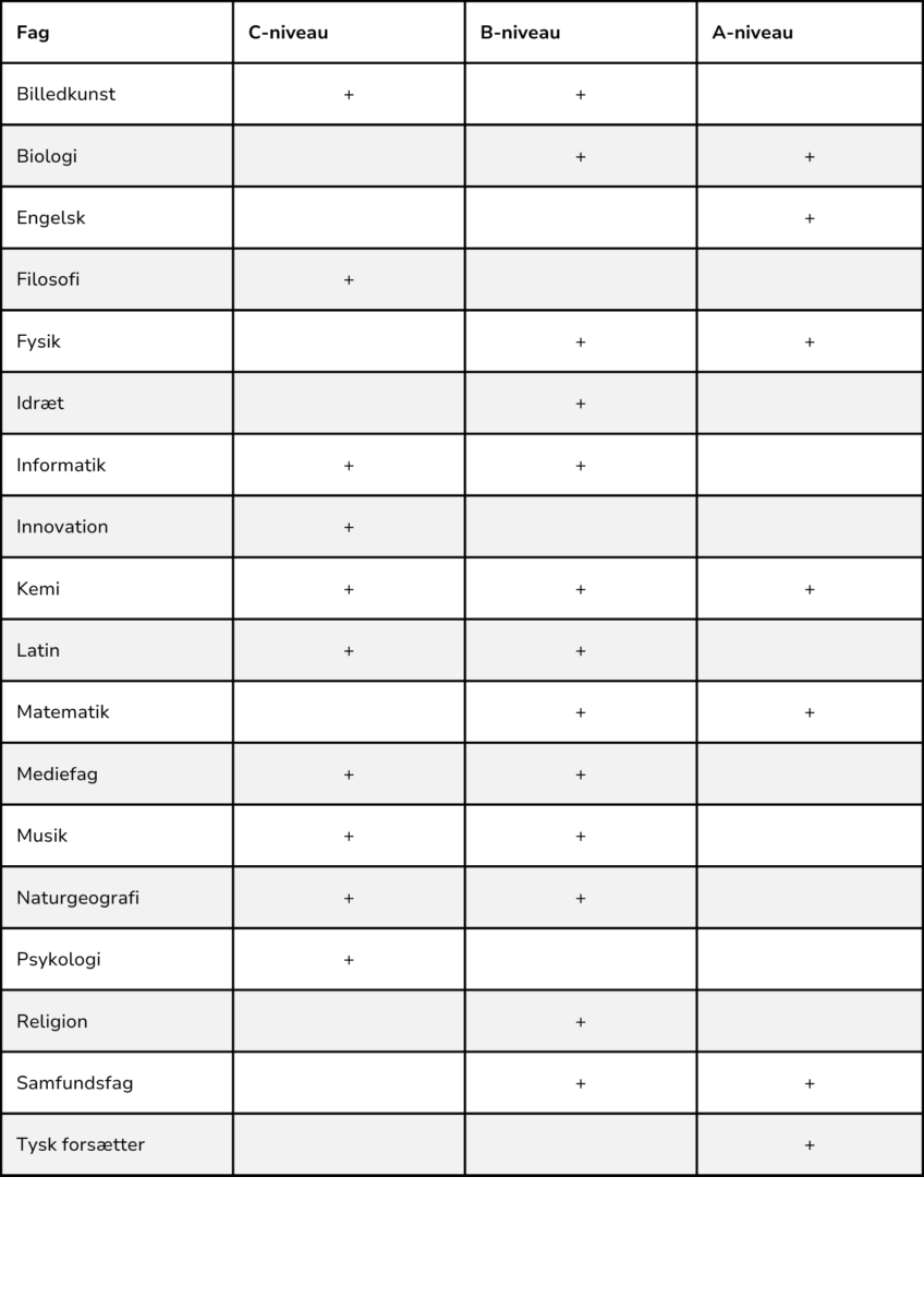 - Obligatoriske fag (dansk, engelsk, historie, idræt, kunstnerisk fag, matematik og samfundsfag).
